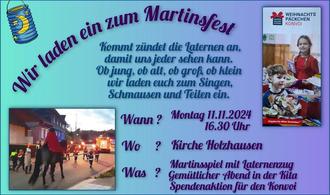Um in dieser kalten und dunklen Jahreszeit wieder Licht und Freude in unserer Gemeinde zu verbreiten, freuen wir uns auf viele interessierte Besucher zu unserem Martinsfest am 11. November 2024 in der Kita Holzhausen. 16.30 Uhr beginnt unser Lichterfest in der Dreifaltigkeitskirche in Holzhausen mit einem Martinsspiel und endet nach einem Laternenumzug mit Feuer, Licht und Leckereien in der Kita Holzhausen. Wir freuen uns darauf mit Ihnen in gemütlicher Atmosphäre diesen Abend zu teilen.