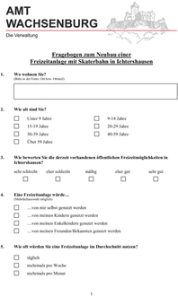 Sofern Sie sich an der Umfrage zum Neubau einer Freizeitanlage mit Skaterbahn in Ichtershausen beteiligen möchten füllen Sie den beiliegenden Fragebogen aus und senden diesen an die Gemeinde Amt Wachsenburg, bis spätestens zum 07.03.2025, zurück.