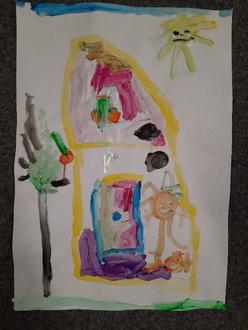 Wir haben hier ganz viel Spielzeug, Bastelsachen, Malsachen, Bücher, Tonifiguren, Fahrzeuge und unsere Hefter wo man sehen kann was wir alles schon gemacht haben. Es gibt einen Turnraum, ein Restaurant, eine