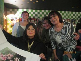 BU: Knöpfer-Freunde beim Betrachten eines Kunstkalenders auf dem Neujahrsempfang: Carlola Busse (2.v.l.), Rebecca Otto, Diana Trefflich und Gudrun Erdmann (v.l.n.r.)
