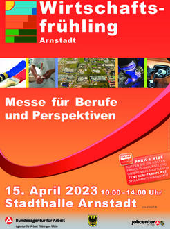 Sie suchen eine Arbeit? Ihre Kinder sind auf Ausbildungssuche oder möchten ein duales Studium beginnen? Sie wollen sich beruflich weiterentwickeln? Sie brauchen Unterstützung beim Bewerbungsmanagement? Dann kommen Sie mit Ihrer Familie zum Arnstädter Wirtschaftsfrühling: Am Samstag nach Ostern, dem 15. April 2023, laden die Agentur für Arbeit Arnstadt, das Jobcenter Ilm-Kreis und die Stadt Arnstadt zur Messe in die Stadthalle Arnstadt ein. Von 10 bis 14 Uhr stellen rund 70 Unternehmen und Institutionen berufliche Chancen rund um die Wirtschaftsregion „Erfurter Kreuz“ und den Ilm-Kreis vor.