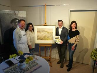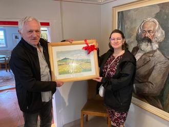 „Dank der großzügigen Spende der Sparkasse Arnstadt-Ilmenau in Höhe von 1.500 Euro können wir uns jetzt an dem schönen Bild erfreuen“ lobte Carola Busse die Unterstützung und überreichte Rene Bandlow vom Sparkassen-Vorstand eine Malerpalette aus Keramik zum Andenken an den Otto-Knöpfer-Freundeskreis.