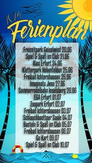 Wir starten mit einem großen Ferienauftakt am Donnerstag, dem 20.06.24, mit einer Fahrt im klimatisierten Reisebus in den Freizeitpark nach Geiselwind. Mit 35,00 € pro Person seid ihr beim Tagesausflug dabei. Darin enthalten sind die Fahrtkosten und der Eintritt. Weitere Highlights sind unteranderem Kino, Kletterwald, GoKart, natürlich jede Woche mindestens ein Freibadbesuch und wir wagen uns auf eine wilde Schlauchbootfahrt auf der Saale bei Jena. Manche Aktivitäten sind Alters- und Teilnehmerbegrenzt. Deshalb informiert Euch gern bei uns direkt vor Ort in den Jugendclubs, per Mail oder gern auch telefonisch.