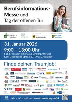 Die Messe findet am Sonnabend, den 31. Januar 2026 von 09.00 - 13.00 Uhr im Staatlichen Berufsschulzentrum Arnstadt-Ilmenau in der Karl-Liebknecht-Str. 27 in Arnstadt statt.