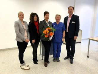Auf dem Foto von links: Isabel Hennig, Gleichstellungsbeauftragte des Ilm-Kreises, Landrätin Petra Enders, Preisträgerin Marina Heinz, Chefärztin Dr. Heike Schlegel-Höfner, Dr. Dr. Marcel John, Geschäftsführer der Ilm-Kreis-Kliniken Arnstadt-Ilmenau.