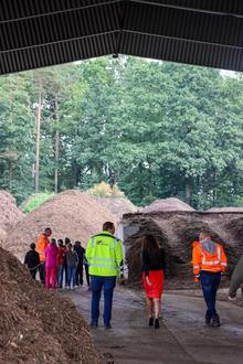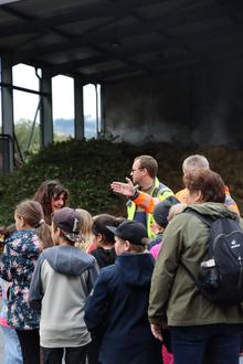 Viertklässlerinnen und -klässler der Grundschule ‚Ziolkowski‘ aus Ilmenau erkunden gemeinsam mit Landrätin Petra Enders die Kreiskompostieranlage in Langewiesen.