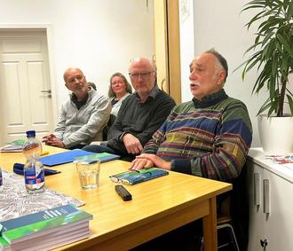 Autor Franz-Josef Wagner (re) mit Michael Doppel, Psychiatriekoordinator des Gesundheitsamt Ilm-Kreis (li), und Moderator Dirk Bennewitz (Mi) zur Lesung in der Psychosozialen Begegnungsstätte Arnstadt.