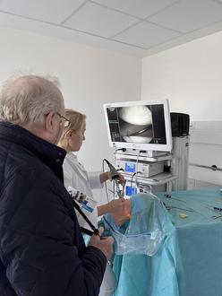 Oberärztin Petra Ortlepp zeigt am Modell wie eine Kniegelenkspiegelung funktioniert.