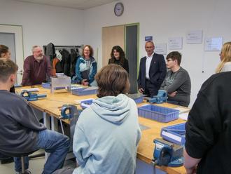 Landrätin Petra Enders zu Besuch in der Jugendunternehmerwerkstatt der IL Metronic Sensortechnik GmbH.
