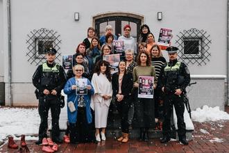 Landrätin Petra Enders mit Isa Hennig, Gleichstellungsbeauftragte Ilm-Kreis, und Nadja Sthamer, Landesgleichstellungsbeauftragte sowie Vertretern von Polizei und Netzwerken zum Fachtag gegen Gewalt am 20. November vor dem Parkcafé in Ilmenau.