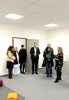 Gesundheitsministerin Heike Werner besichtigt die Räumlichkeiten der neuen Elternschule Kunterbunt. Auf dem Bild zu sehen (v. li. n. re.): Landrätin Petra Enders, Dr. med. Pia Unthan (Leitende Oberärztin), Diana Schmidt (Hebamme), Dr. med. Marcel John (Geschäftsführer), Matthias Keschke (Pflegedirektor), Anika Buntrock (Leitende Hebamme). Bildquelle: Jette Schneider | Ilm-Kreis-Kliniken