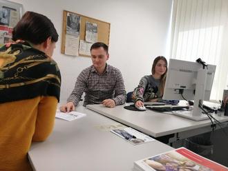 Im Bild ukrainische Sprachmittlerin des Jobcenters zusammen mit einem Mitarbeiter des Betreuungsprojektes für anerkannte Flüchtlinge im Ilm-Kreis während einer Beratungssituation.