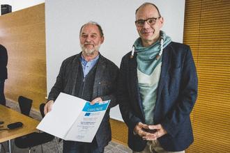 Torsten Weil, Staatssekretär im Ministerium für Infrastruktur und Landwirtschaft, übergibt Rainer Zobel, Vereinsvorsitzender der RAG Gotha-Ilm-Kreis-Erfurt die Urkunde. Bildrechte: TMIL (Thüringer Ministerium für Infrastruktur und Landwirtschaft) / D. Santana