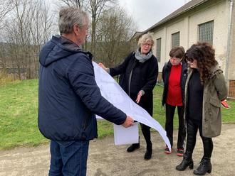 Bauleiter Michael Herchenhahn, Architektin Kerstin Schuster, Schulleiterin Ute Schmidt und Landrätin Petra Enders vor Ort in Stützerbach.