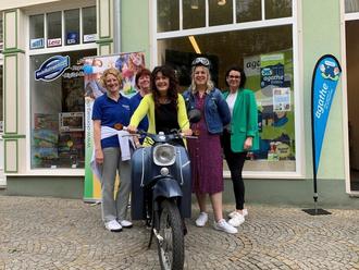 Die AGATHE-Fachberaterinnen Antje Hübel und Doreen Klauder, Landrätin Petra Enders, Nicole May, Beauftragte für Gleichstellung und Seniorenarbeit, und Christiane Herrmann, AGATHE-Projektkoordinatorin und Beratungsfachkraft „Kommunales Senioren- und Pflegeinformationszentrum/Seniorenamt, vor dem Arnstädter Pop-Up-Store (v. l.).