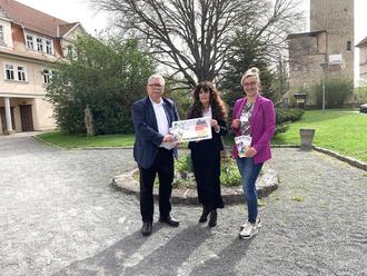 Landrätin Petra Enders mit Stephan Rothweil, Seniorenbeauftragter des Ilm-Kreises, und Sarah Höring, Geschäftsführerin IOV Omnibusverkehr GmbH Ilmenau zur Präsentation des Seniorentickets.