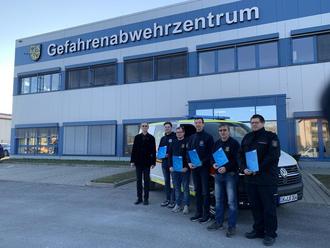 Mit Bastian Wenske, Danny Helbig, Philipp Bischoff und Max Hoffmann haben vier engagierte Helfer die bayerische „Fluthelfer-Nadel 2024“ erhalten. Kay Tischer, Hauptamtlicher Beigeordneter des Ilm-Kreises, übergab die Nadeln dieser Tage an die ehrenamtlichen Kräfte, die im Juni 2024 in Bayern in den betroffenen Gebieten im Einsatz waren und in Dönau-Wörth und Günzburg wichtige Koordinierungsaufgaben der Hilfskräfte übernahmen. Unterstützt wurden sie dabei vor Ort in Bayern von Sebastian Arnold, Leiter des Amtes für Brand- und Katastrophenschutz des Ilm-Kreises.