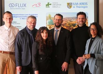 v. l. n. r.: Lars Sommerfeld, Projektleiter für den Ilm-Kreis für die MitfahrApp, Franz-Josef Willems, Vorsitzender des Vorstandes der Initiative Erfurter Kreuz, Landrätin Petra Enders, Stefan Landes, Geschäftsführer von N3 und Vorstandsmitglied der Initiative Erfurter Kreuz, Ivan Cihlarz und Anika Rexroth von goFLUX Mobility.