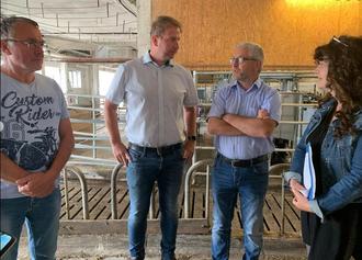 Reinhard Gebser, Geschäftsführer der Agrargesellschaft Deube mbH Nahwinden, Ralf Gumpert, Vorsitzender des Kreisbauernverbandes Ilm-Kreis e. V., Michael Kaiser von der Landwirtschaftlichen Erzeugergesellschaft mbH Branchewinda und Landrätin Petra Enders im Gespräch in den Stallanlagen in Kleinliebringen.
