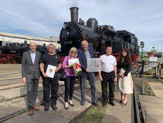 Sven Hauschild, Sparkasse Arnstadt-Ilmenau, Michael Klatt vom Förderverein Bahnbetriebswerk Arnstadt e. V., Evelyn und Udo Stark, Uwe Pfotenhauer vom Jonastalverein e. V. und Landrätin Petra Enders zur Übergabe des Denkmalpreises des Ilm-Kreises 2023 im Bahnbetriebswerk Arnstadt.
