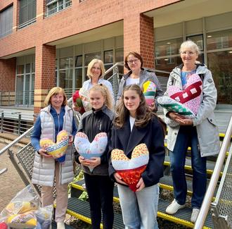 Lara Goldammer und Rosalie Link übergaben ihre selbstgenähten Herzkissen an die Klinik für Frauenheilkunde und Geburtshilfe (von links nach rechts: Katja Becker, Dr. med. Pia Unthan, Lara Goldammer, Dagmar Khuttan, Rosalie Link, Ramona Lahne)