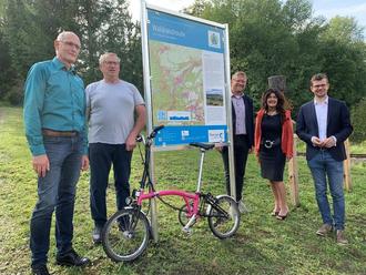 Am Rastplatz in Gräfenroda-Dörrberg der Waldrandroute: Jörg Thamm, Vorsitzender VG Geratal/Plaue, Holger Frankenberg, Ortschaftsbürgermeister Geraberg, Dominik Straube, Bürgermeister Landgemeinde Geratal, Landrätin Petra Enders und Ilmenaus Oberbürgermeister Dr. Daniel Schultheiß (v. l.)