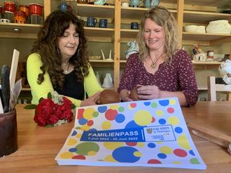 Landrätin Petra Enders und Doreen Duelli zur Präsentation des neuen Familienpasses des Ilm-Kreises in der "Werkstatt des Herzens" in Langewiesen.