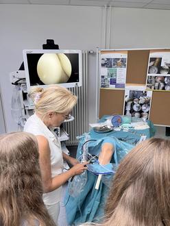 Die leitende Oberärztin Petra Ortlepp zeigt am Modell die Spiegelung eines Kniegelenks