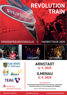 Mit dem „Revolution Train“ ist vom 4. bis 6. September ein in seiner Art einmaliges und multimediales Instrument im Ilm-Kreis zu Gast, das in Form einer interaktiven und erlebnisorientierten Pädagogik Drogenprävention vermittelt und sich vorrangig an Schülerinnen und Schüler richtet. Die Idee des Projektes ist es, durch das Erleben, Hören und Sehen alle menschlichen Sinne anzusprechen und so auf die Widerstandsfähigkeit gegenüber Suchtmitteln einzuwirken.