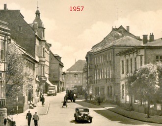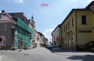 Der Grund dafür ist in dem Großbrand zu suchen, welcher vom 31.8. zum 1.9.1865 mehrere Häuser vernichtete. Die Brandstätten wurden von der Stadt erworben und darauf neue Häuser errichtet, deren Flucht zurückgesetzt wurde, was auf dem Foto aus dem Jahr 2022 mit dem Blick Richtung Markt gut zu erkennen ist.