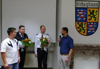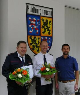 Bürgermeister Patrick Hammerschmidt verpflichtet Marcus Baumann (Mitte) als Stadtbrandmeister und Johannes Adam (linke Seite) als stellvertr. Stadtbrandmeister