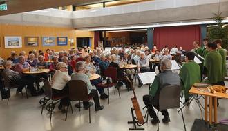 Wie immer begann pünktlich 15:00 Uhr im liebevoll gestalteten Foyer der gesellige Nachmittag mit einer Begrüßung und wertschätzenden Worten für alle Anwesenden. Runde, weihnachtlich gedeckte Tische, bestückt mit jeweils fünf Stühlen, sorgen für das Zusammenkommen und sich kennenlernen in gemütlicher Atmosphäre. Mit achtzig Gästen war, wiedererwartend, das Foyer prall gefüllt.
