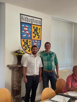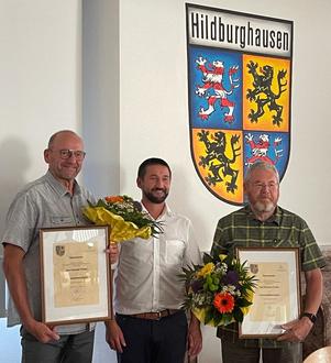 Bürgermeister Patrick Hammerschmidt (Mitte) übereichte Eberhard Wiener (Links) und dem Beigeordneten Burkhard Knittel (Rechts) die Ehrenurkunden zum Ehrenstadtrat in der Stadtratssitzung am 22.08.24.