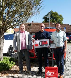 "Die Aufgaben der Feuerwehren werden immer vielseitiger und anspruchsvoller. Daher haben sich die SV SparkassenVersicherung und die SV Kommunal entschlossen, die Feuerwehren mit einem weiteren, hochwertigen Ausrüstungsgegenstand zu unterstützen: Einem tragbarem LED-Beleuchtungssystem des Herstellers Rosenbauer, welches mit Akku betrieben wird.