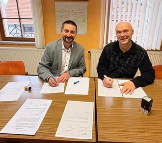 Die beiden Bürgermeister Patrick Hammerschmidt und Stefan Ullrich unterzeichnen die Vereinbarung