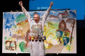 Live auf der Bühne malte er ein Bild zu Motto „750 Jahre Stadtrecht Hildburghausen“, das nun nach einem dreiviertel Jahr seinen Besitzer sucht.
