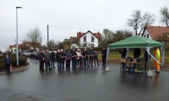 Frau Geißenhöner, 1. Beigeordneter B. Knittel, B. Wütscher (Stadträtin), Herr Kotschate (STRABAG Ritschenhausen), T. Hanft (TEN), Herr Reichardt (Stadtrat), Herr Dr. Nowak (Stadtrat), Herr Vonderlind (Stadtrat), Ortsteilbürgermeister H. Geißenhöner (vorne), E. Wiener (Stadtrat - hinten), Herr Feigenspan (WAVH), Herr Krebs (Stadtrat), Frau Obst (Vorsitzende des Stadtrates), Herr R. Bumann (Stadtrat), Bürgermeister T. Kummer, M. Bumann (Stadtrat), Herr Greiner (Ingenieurbüro), Frau Frendel (TLLLR Meiningen), Bauleiter Fabian Kaspar (IB Greiner), Herr W. Schippel (Planung Straßenbeleuchtung, unter dem Zelt links stehend)