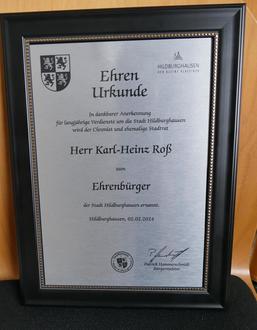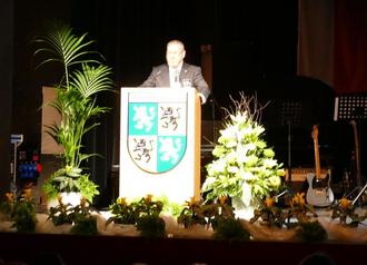 Der Beigeordnete Burkhard Knittel hält die Laudatio für den Ehrenbürger Karl-Heinz Roß