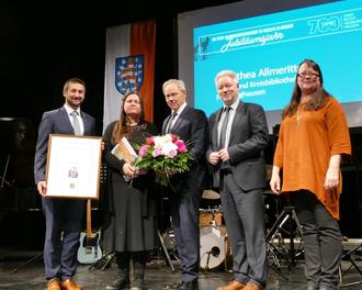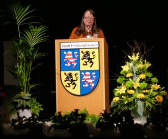 Die Leiterin der Stadt- und Kreisbibliothek Frau Allmeritter hielt die Laudatio für Frau Alexandra Messerschmidt, die Inhaberin der Buchhandlung am Markt