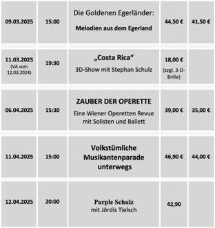 | Info & Verkauf Touristinformation, Tel. 03685/774184, Internet: www.stadttheater-hildburghausen.de sowie über www.ticketshop-thueringen.de, www.eventim.de und www.reservix.de |
