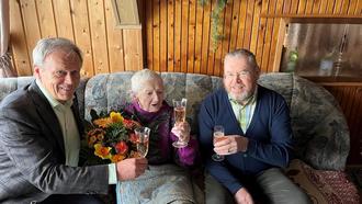 Landrat Thomas Müller und der Hildburghäuser Beigeordnete Burkhard Knittel überbrachten der noch relativ rüstigen Jubilarin die Glückwünsche des Landkreises und der Stadt Hildburghausen und stießen mit der Jubilarin auf noch hoffentlich einige glückliche Jahre im Kreise ihrer Angehörigen an, die sie liebevoll, noch in der eigenen Wohnung wohnend, betreuen.