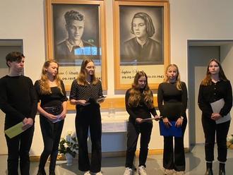 Am Ende des Gesprächs leiteten die Schüler die Bedeutung der Taten der Geschwister Scholl für sich und die heutige Gesellschaft ab. Sie erkannten die Inspiration und den Anstoß dazu, das eigene Handeln stets neu zu überdenken und den Mut zu haben, zu hinterfragen, sich in die Gesellschaft einzubringen und sich seiner eigenen Verantwortung bewusst zu sein. Nach dieser ausdrucksstarken Darbietung erklang erneut Klavierspiel, während jeder Schüler jeweils eine weiße Rose in Gedenken an ein Mitglied der Freundesgruppe in eine Vase vor den Abbildern von Hans und Sophie Scholl stellte. Auch die Besucher hatten Rosen mitgebracht, die sie vor den Bildern niederlegten. Sie dankten den Schülern sowie Lehrern des Gymnasiums dafür, dass diese jedes Jahr die Möglichkeit zum gemeinsamen Gedenken eröffnen.