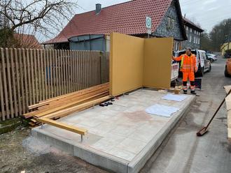 Durch das Bauamt und den Bauhof wurde ein provisorisches Buswartehäuschen aufgestellt. Es ist so konzipiert, dass es im Zusammenhang mit der ausstehenden Dorfplatzsanierung abgebaut, an anderer Stelle wiederaufgebaut und weitergenutzt werden kann.
