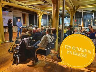 Diesmal kamen ca. 50 Interessierte in den Bürgersaal, um die Multimedia-Show von Stefan Klopf über zwei individuelle Australien-Reisen nicht zu verpassen. Um es gleich vorwegzunehmen, der Vortrag war Unterhaltung par excellence und er machte neugierig auf terra australis, das „südliche Land“, Down Under.