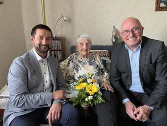 Im Namen der Stadt und des Landkreises Hildburghausen gratulieren Patrick Hammerschmidt und Dirk Linder Frau Liesbeth Terodde zu ihrem 101. Geburtstag.
