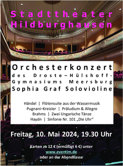 Am Freitag, 10. Mai 2024, macht das Schulorchester des Meersburger Droste-Hülshoff-Gymnasiums in Hildburghausen Konzertstation. Es erklingen die Flötensuite von Händel, Präludium und Allegro von Pugnani-Kreisler, zwei Ungarische Tänze von Brahms und die Sinfonie Nr. 101 „Die Uhr“ von Haydn