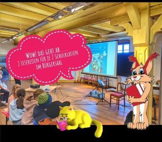 Am letzten Schultag vor den Osterferien gab es für die Zweit- und Drittklässler der Grundschule 1 eine besondere Überraschung. Die Stadt- und Kreisbibliothek Hildburghausen hatte in Kooperation mit dem Friedrich-Boedecker-Kreis Thüringen e.V. zu einer Lesung mit dem Kinderbuchautor Jens Reinländer eingeladen. Unter dem Motto „Lachen macht lesestark“ gingen zuerst die 2. Klassen der Frage nach, was Buchstaben mit Köchen zu tun haben und wieso A und O diese froh machen. Wie entstanden Buchstaben überhaupt? Diese Frage hat sich bestimmt der eine oder andere Zuhörer schon selbst einmal gestellt. Aufmerksam hörten die Kinder zu, was der Autor dazu zu sagen hatte, wobei zuhören eigentlich das falsche Wort ist, denn diese Lesung war alles andere als üblich oder gewöhnlich. Mit viel Action, Mimik, Gestik, Einsatz von Technik und immer unter Einbezug seiner kleinen Zuhörer sorgte Herr Reinländer für viele Lacher und eine unterhaltsame Stunde, die schnell vorbei war.