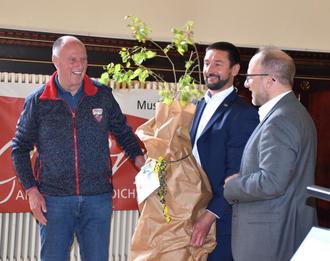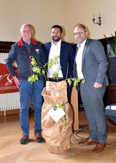 Bürgermeister Roger Nießen und........................ von der Freundschaftsgesellschaft würselen überreichten dem Bürgermeister einen Ableger einer 200 Jahre alten Blutbuche