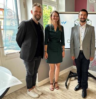 Michael Czapla (links) und Katharina Schmidt vom Verein Coworking Hildburghausen e.V. mit Hildburghausens Bürgermeister Patrick Hammerschmidt in der Villa 11.