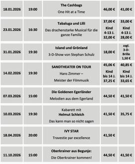 | Info & Verkauf Touristinformation, Tel. 03685/774184, Internet: www.stadttheater-hildburghausen.de sowie über www.ticketshop-thueringen.de, www.eventim.de und www.reservix.de |